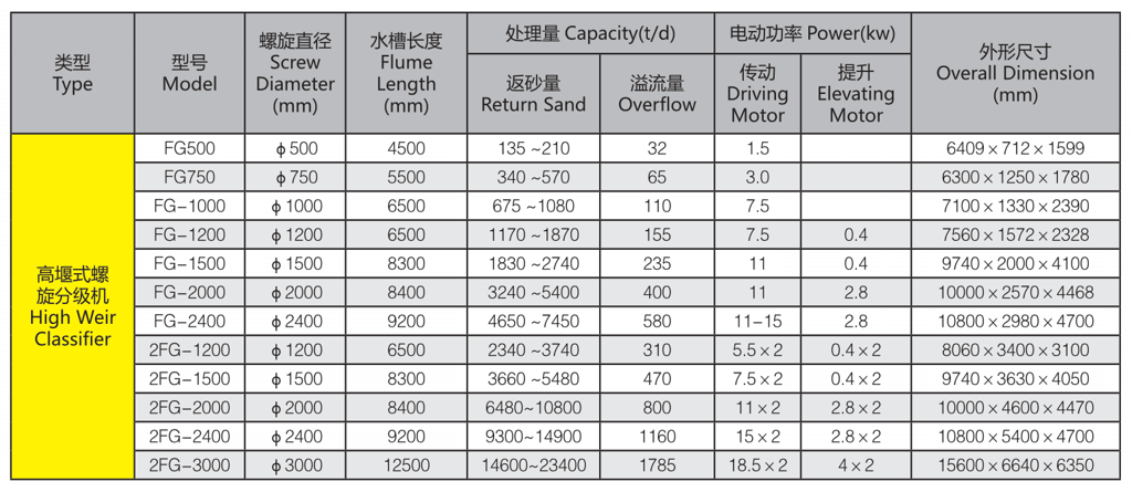 There are four different types of the classifier: high-weir single spiral, high-weir twin spiral, sunken single spiral and sunken twin spiral.